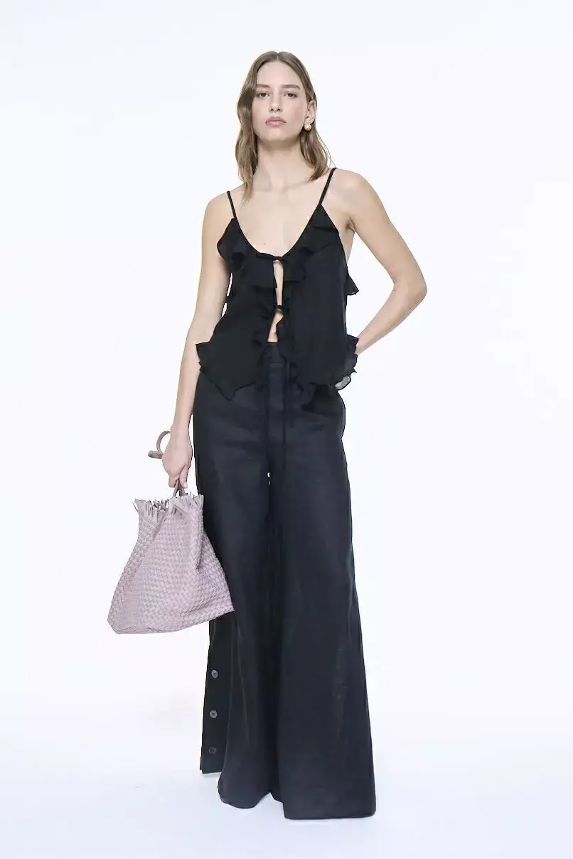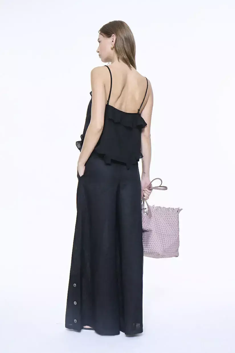 Top bretero con escote en v y apertura central en delantera con tiras para atar. Posee volados en escote delantero, centro de prenda y en ruedo. Confeccionado en gasa de algodón.