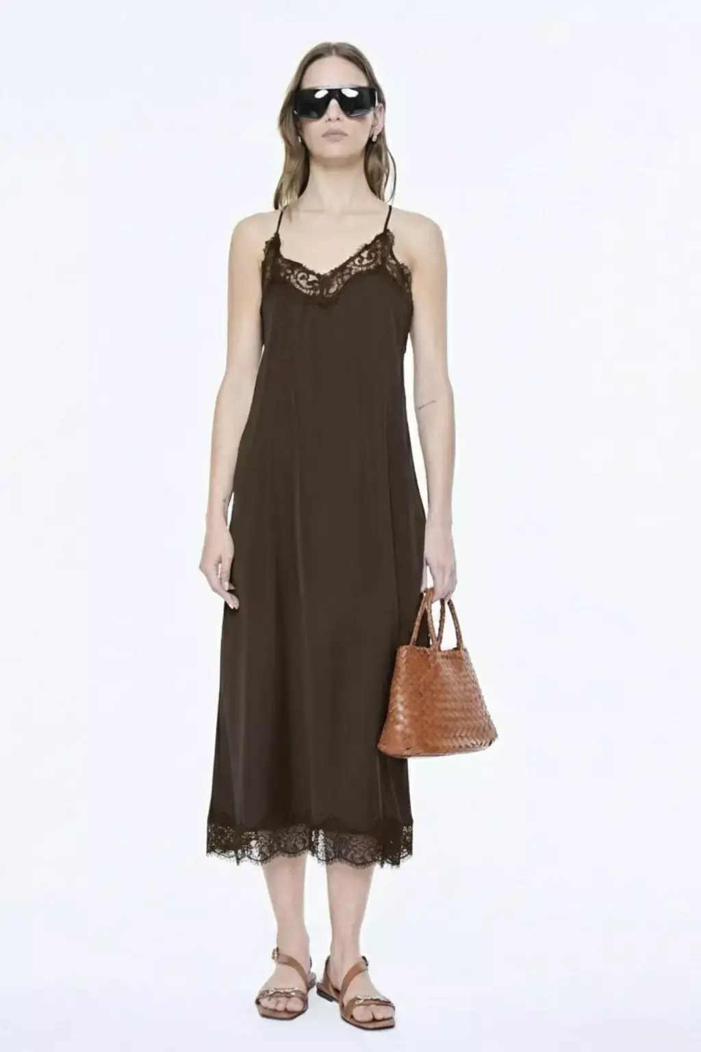 Vestido lencero confeccionado en natural crepe de viscosa en combinación con encaje en escote delantero y de espalda. De largo midi y calce regular.